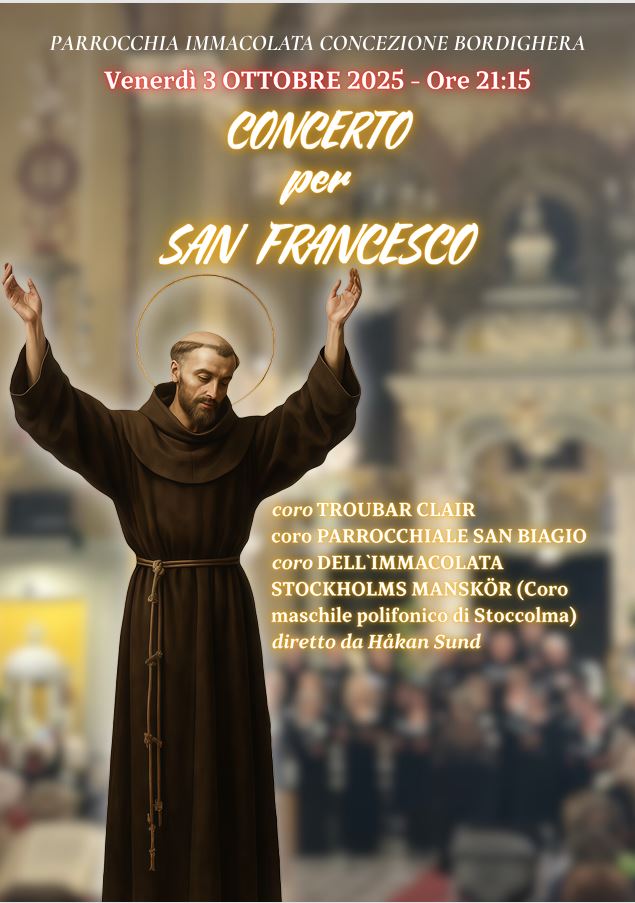 Konsert till minne av San Francesco i Chiesa di Terra Santa, Via Vittorio Emanuele 75, Corner via Terrasanta, Bordighera.